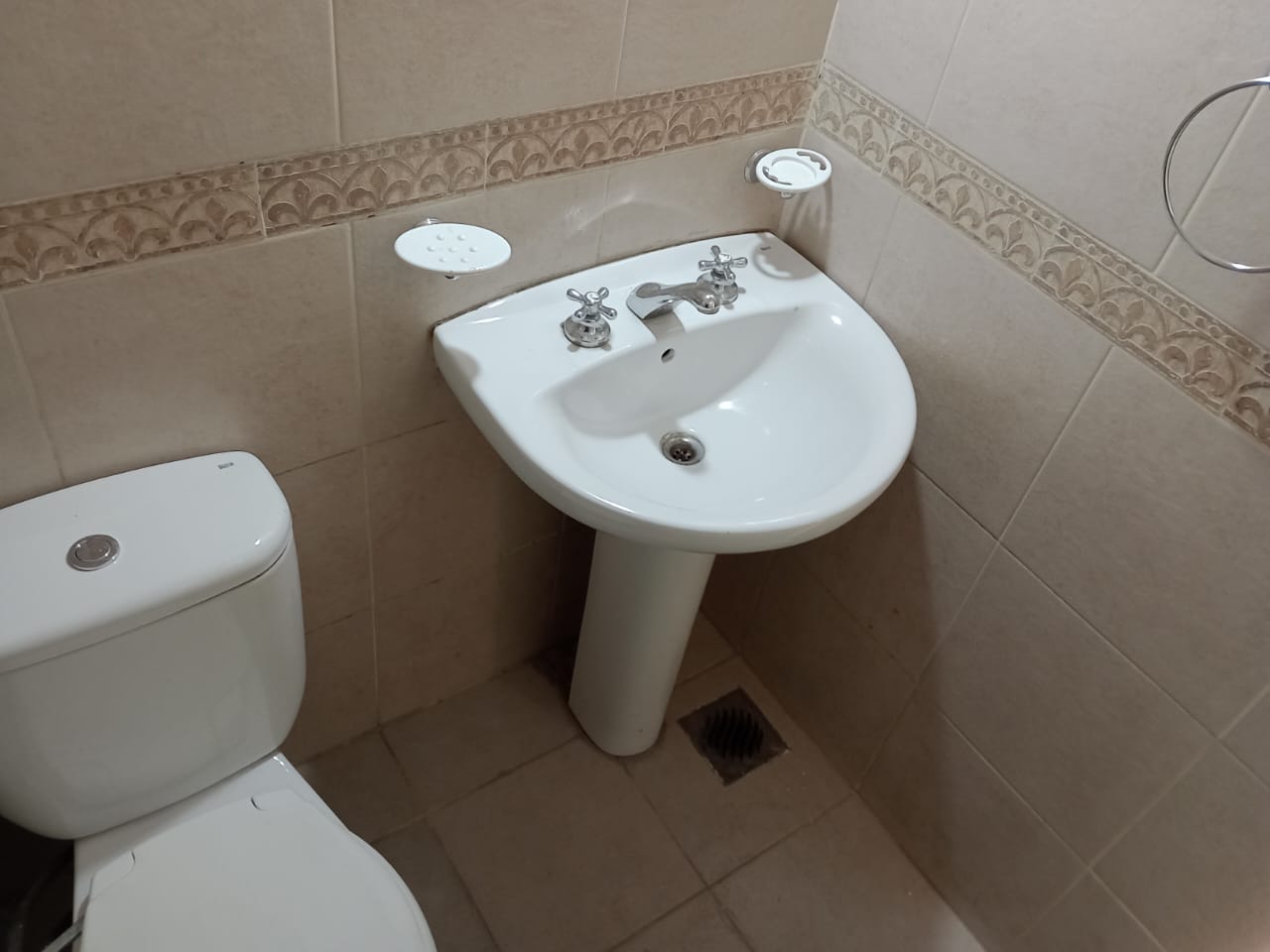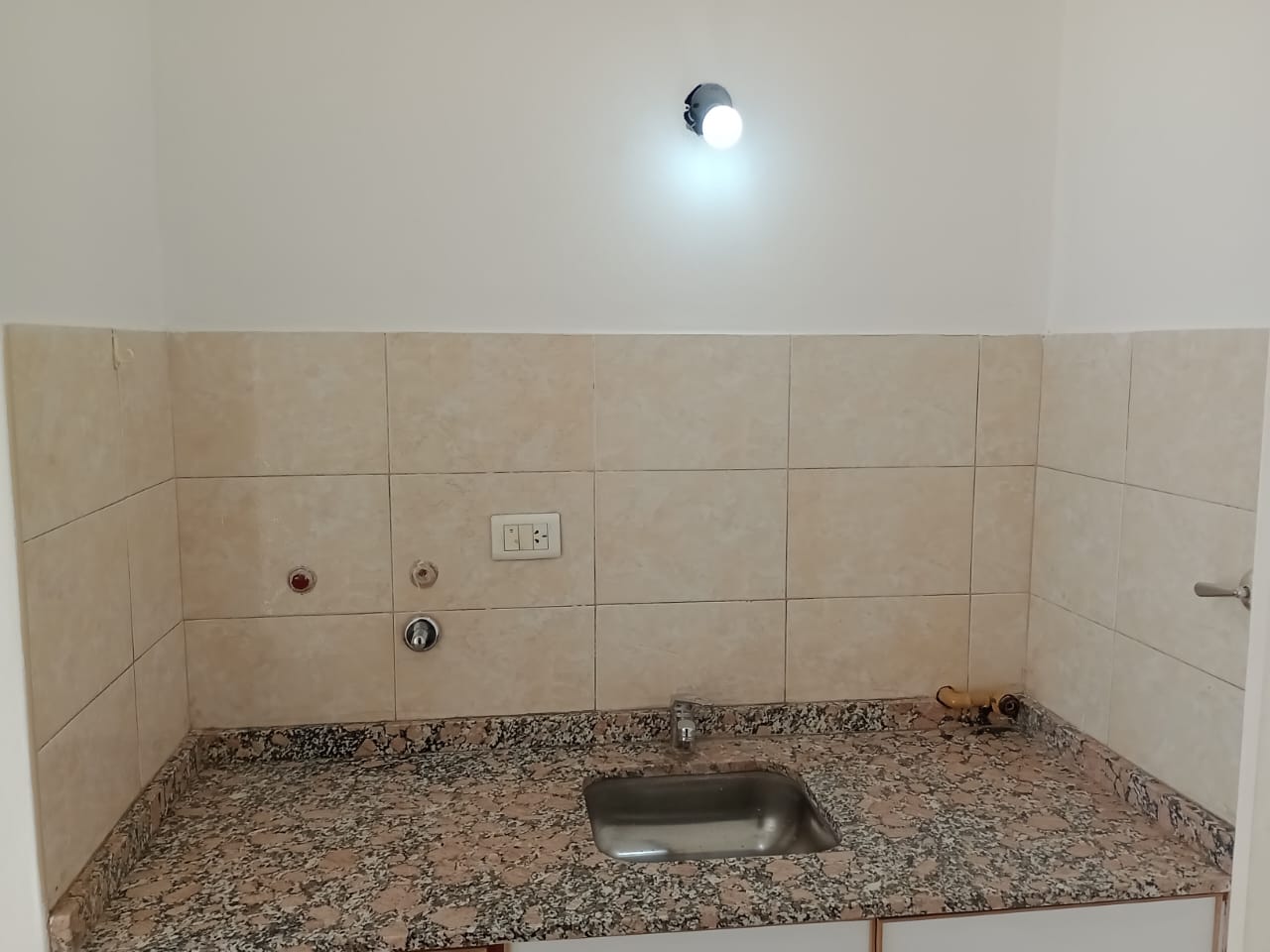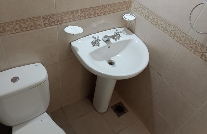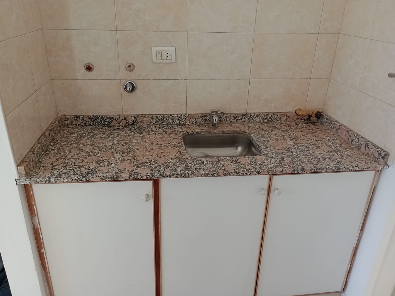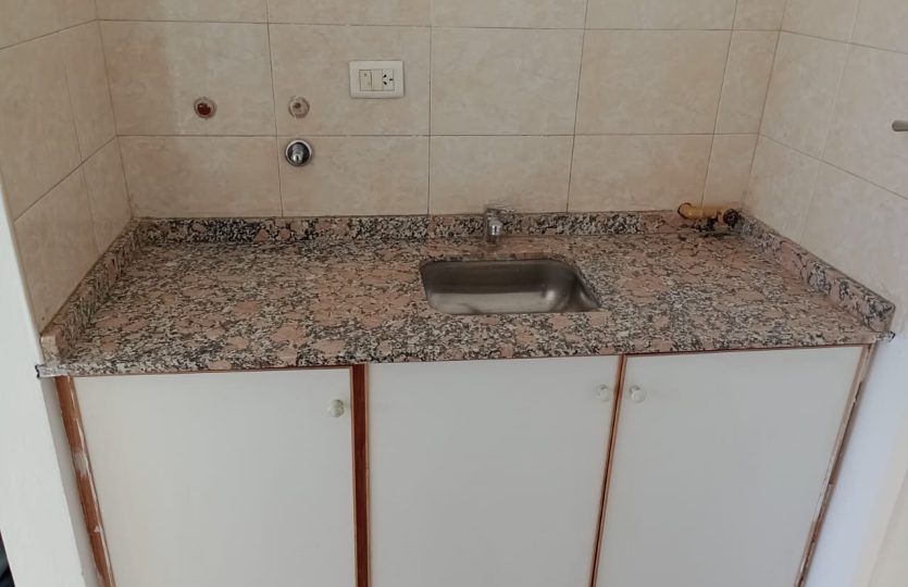 ✅ Baño con bidematic y kitchenet con revestimiento cerámico; mueble de bajo mesada y artefacto de anafe a gas.